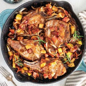 - Bake until an instant-read thermometer inserted in thickest portion of pork chops registers 160°, 15 to 20 minutes. Let stand for 10 minutes. Top with bacon. Garnish with rosemary, if desired.
