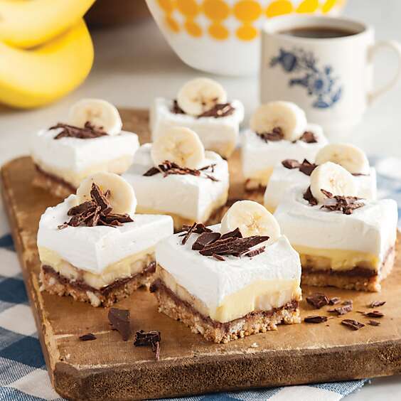 - For topping: In a medium bowl, beat all ingredients with a mixer at high speed until stiff peaks form. Spread onto pudding mixture. Cover and refrigerate for at least 4 hours before serving or up to 8 hours. Using excess foil as handles, remove from pan, and cut into bars. Garnish with chocolate and banana, if desired.