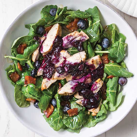- On a serving platter, toss together kale and Warm Bacon Vinaigrette. Place chicken on top salad, and drizzle with blueberry sauce.