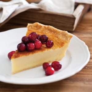 This delightful buttermilk pie is served with a sweet cranberry and raspberry topping.