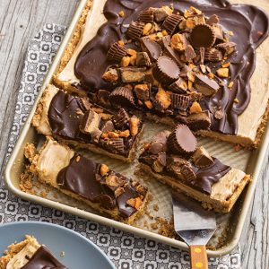 - For crust: In the work bowl of a food processor, pulse candy bars into fine crumbs. In a medium bowl, stir together candy crumbs, graham cracker crumbs, and melted butter. Using the bottom of a measuring cup, press mixture into bottom and up sides of a rimmed 13x9-inch baking sheet. Freeze until firm, about 10 minutes.