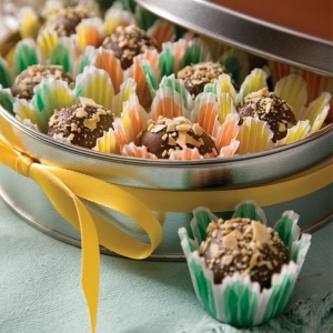 - Line a baking sheet with parchment paper. Shape chocolate mixture into 1-inch balls. Using two forks, dip truffles into melted candy coating, letting excess drip off. Place truffles on prepared baking sheet. Sprinkle with chopped toasted almonds, if desired. Let stand until coating is set. Store, covered, at room temperature for up to 2 weeks.