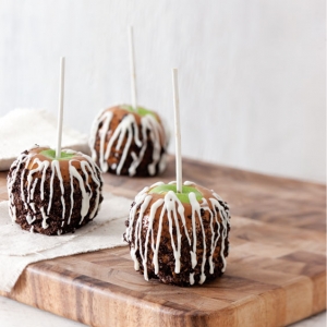 These caramel apples are dusted in crunchy cookie crumbles and drizzled with vanilla candy coating.