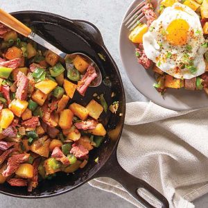 - In same skillet, heat remaining 1 tablespoon oil over medium-high heat. Add bell peppers, red onion, and green onion. Cook until vegetables are lightly browned, 3 to 4 minutes. Stir in corned beef, garlic, remaining 1 teaspoon salt, remaining 1 teaspoon paprika, and remaining ½ teaspoon pepper. Cook until vegetables are tender and corned beef is lightly browned, 5 to 7 minutes. Add potato mixture, and cook until heated through, 2 to 3 minutes. Serve immediately with fried eggs. Garnish with green onion and paprika, if desired.