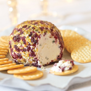 - In a shallow dish, combine pistachios and cranberries. Unwrap cheese ball, and roll in nut mixture. Serve immediately with crackers, or wrap with plastic wrap and refrigerate for up to 3 days.