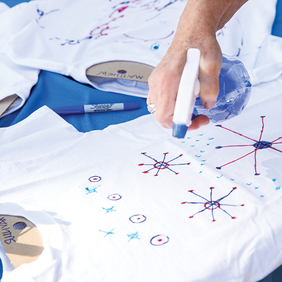 [fusion_builder_column type=”2_3″ last=”yes” class=”” id=””]Gather your supplies. I found inexpensive white T-shirts, reusable cardboard T-shirt forms, and a mix of red and blue Sharpie pens at my local craft store. I had a shirt for each child ready to go with the form inside so the pens would not bleed through to the back. I also filled spray bottles with rubbing alcohol before we began the project. [/fusion_builder_column]
