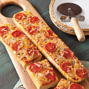 - Place frozen garlic bread cut side up on prepared pan. Spread pizza sauce onto bread, and sprinkle with Italian seasoning. Sprinkle 1 cup cheese onto sauce, and top with pepperoni. Sprinkle with remaining ½ cup cheese.