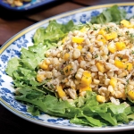- In a large bowl, whisk together olive oil, lemon juice, vinegar, and salt. Stir in corn, crab, mango, and shallot. Arrange arugula on a serving platter, and top with corn mixture. Serve immediately.