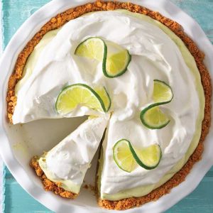 6. Just before serving, spread sweetened whipped cream onto pie, and garnish with thinly sliced limes, if desired.