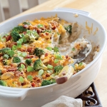- In a large bowl, stir together potatoes, cream cheese, and pepper until well combined. Stir in half each of chicken, cheese, broccoli, green onion, and bacon. Spread mixture in prepared pan, and layer with remaining chicken, broccoli, green onion, and bacon; sprinkle with remaining cheese.