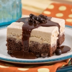 5. Spread softened ice cream over cake. Cover and freeze for at least 4 hours or up to 1 month. Serve with warm fudge sauce. Garnish with chocolate-covered espresso beans, if desired.