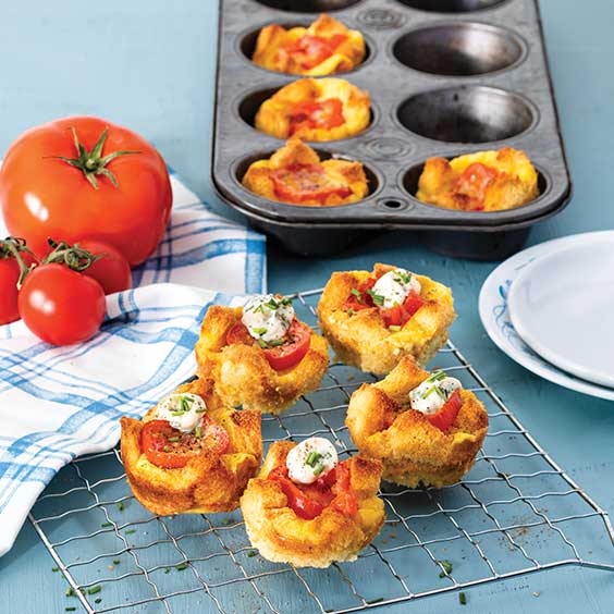 - Cut off tops and bottoms of tomatoes to leave a 1⁄2-inch cross section. Place 1 tomato section into each toast cup, gently pressing to secure.