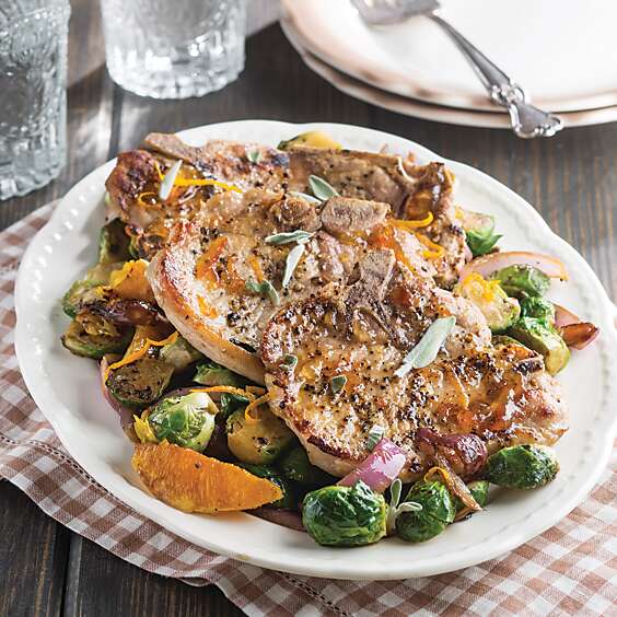 Nothing beats a pork chop sizzling in a skillet, but this zesty Orange-Sage Pork Chops and Brussels Sprouts ups the ante for weeknight meals.