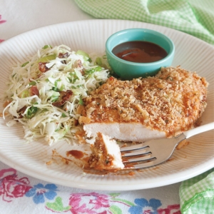 Make this Oven-Fried Barbecue Chicken with Wilted Slaw for a light and delicious take on barbecue. Boneless pork chops can be used instead of chicken breasts.