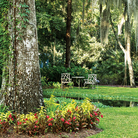 A man-made pond was added to welcome guests as they drive onto the property and around to her home. The serene body of water is edged with yellow iris, hyacinth, and lotus and accompanied by the peaceful bubbling sound of a recirculating fountain.