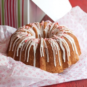 - In a small bowl, whisk together confectioners’ sugar and remaining 2 tablespoons coffee creamer until smooth. Drizzle over cooled cake, and sprinkle with crushed peppermints before serving.