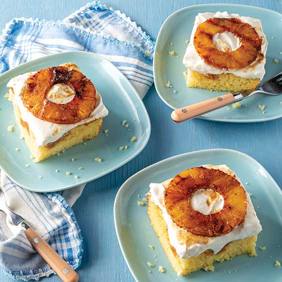 Dulce de leche and a sweetened condensed milk frosting make this poke cake delectably moist. Top with Grilled Pineapple rings for an added burst of flavor.