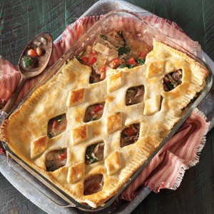 - Melt butter in pot over medium heat. Stir in flour; cook, stirring constantly, for 1 minute. Gradually stir in broth; cook, stirring constantly, until thickened, about 10 minutes. Stir in greens, brown sugar, and vinegar; cook, stirring constantly, until thickened. Remove from heat, and stir in vegetables, pork, beans, salt, and red pepper; cook mixture just until it comes to a simmer. Pour mixture into prepared pan, and top with prepared Cornmeal Buttermilk Piecrust. Cut decorative slits into crust to let steam escape. In a small bowl, whisk together egg and water; brush onto crust.