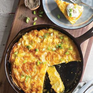 5. Bake until center is set and golden brown, 15 to 20 minutes. Let stand for 10 minutes. Serve with sour cream and green onion.
