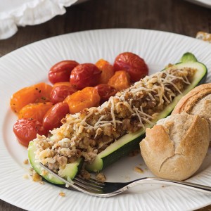 Paired with simple roasted tomatoes, this sausage-stuffed zucchini makes a quick and satisfying weeknight supper.
