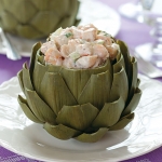 Sweet shrimp salad gets stuffed into steamed fresh artichokes.