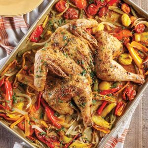 This flavorful chicken, cooked on a bed of peppers and tomatoes, is the perfect one-pan dinner for busy weeknights.