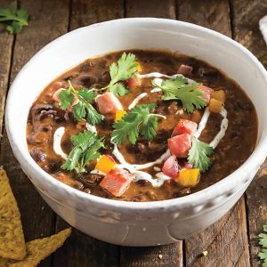 Cozy up with a hearty bowl of creamy Spicy Black Bean Soup with bits of ham, bell peppers, and zesty Cilantro Cream topping.
