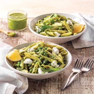 - In a large serving bowl, combine penne, 1⁄2 cup pesto, peas, and kale. Gradually add reserved 1⁄2 cup pasta water until mixture reaches desired consistency. Garnish with goat cheese and lemon, if desired.