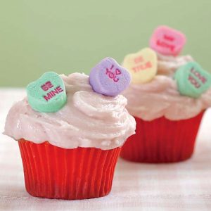 - Spread or pipe Strawberry Buttercream onto cooled cupcakes. Garnish with candy hearts, if desired. Store in an airtight container for up to 2 days.