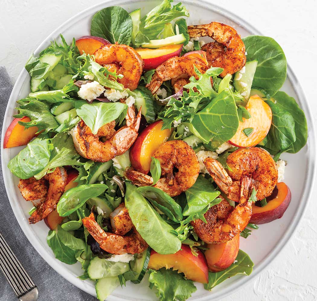 Blackened Fried Shrimp, fresh summer produce, and a simple champagne vinegar dressing make the perfect toppings for this delicious salad.