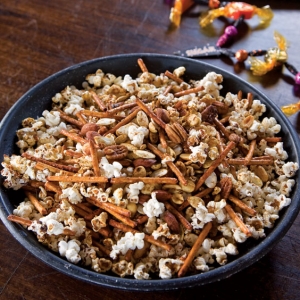 This popcorn mix is full of nuts and pretzel sticks and is tossed in a zesty seasoning blend.