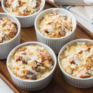 - In a large bowl, whisk together milks, cream, and extracts. Gently fold in all cubed bread and flaked coconut. Divide mixture among prepared ramekins.